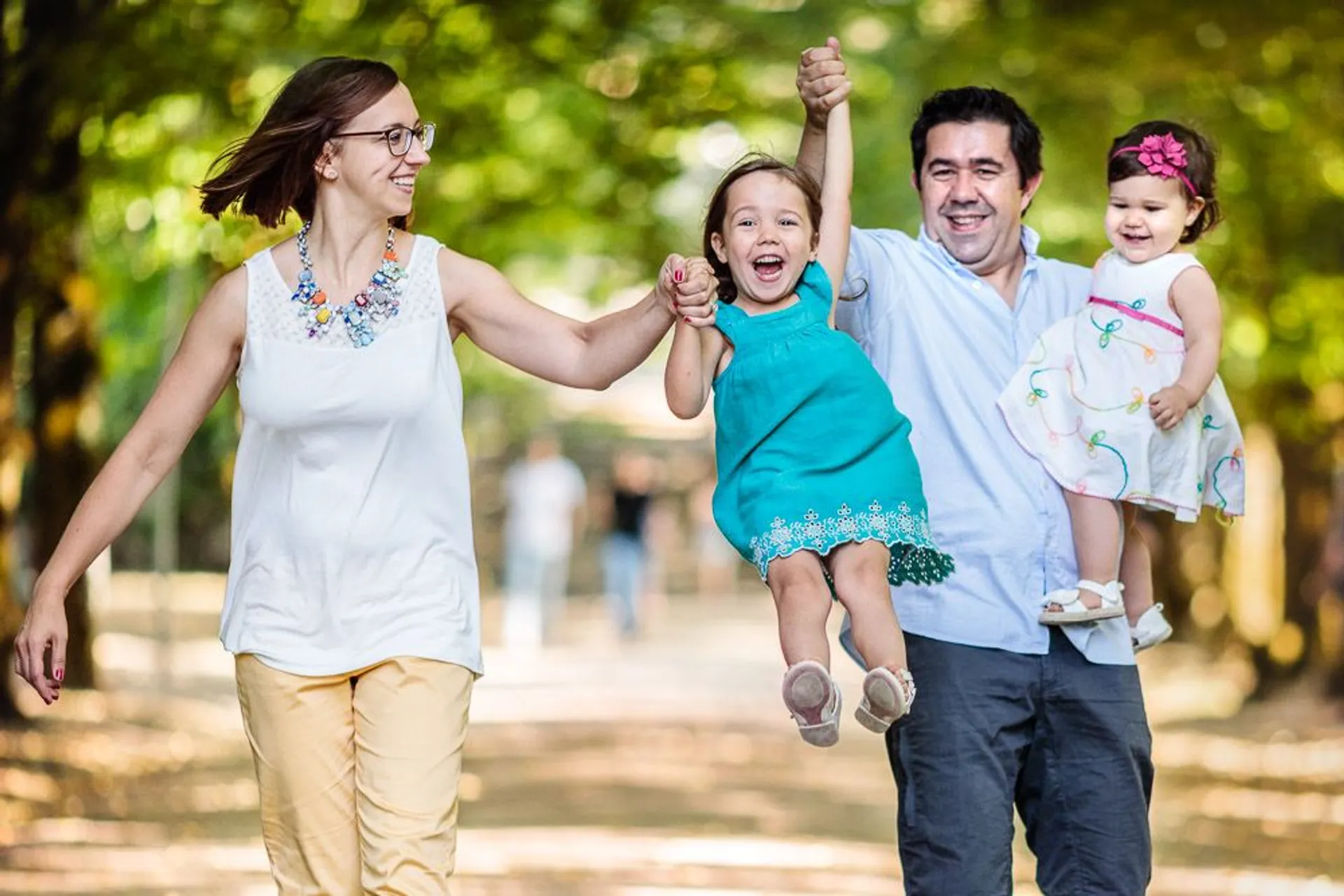 As crianças são as estrelas principais da fotografia de família. Elas podem vestir-se com cores conjugadas com as dos pais ou podem estar ligeiramente mais em evidência. Nesse caso, fica bem dar um toque de cor um pouco mais vibrante, seja num acessório ou numa peça de roupa.